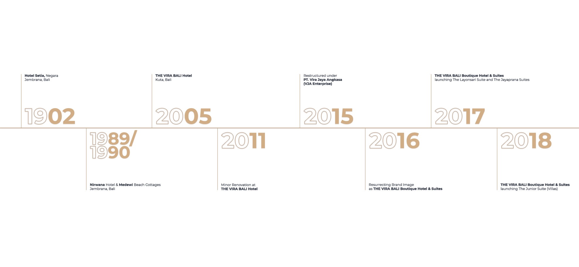 In 2015 the business was reconstructed under PT. Vira Jaya Angkasa or VJA Enterprise. Within 2016 until 2018, the hotel business and management had been completely transformed professionally. The hotel went under major transformations, refurbished and born anew. It became THE VIRA BALI Boutique Hotel & Suites.